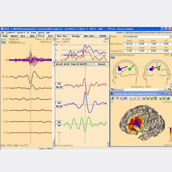 Choose the best signal processing for your EEG and MEG data BESA is the most widely used software for source analysis and dipole localization in EEG and MEG research. BESA Research has been developed on the basis of 30 years experience in human brain research by the team around Michael Scherg, University of Heidelberg, and Patrick Berg, University of Konstanz. BESA Research is a highly versatile and user-friendly Windows? program with optimized tools and scripts to preprocess raw or averaged data for source analysis and connectivity analysis. All important aspects of source analysis are displayed in one window for immediate selection of a wide range of tools. The same holds true for the source coherence / time-frequency module, and other analysis windows. BESA Research provides fast and easy hypothesis testing, a variety of source analysis algorithms including cortical imaging and volume imaging methods, integration with MRI and fMRI, age-appropriate template head models (FEM) as well as the possibility to import individual head models (FEM) generated by BESA MRI 2.0.
