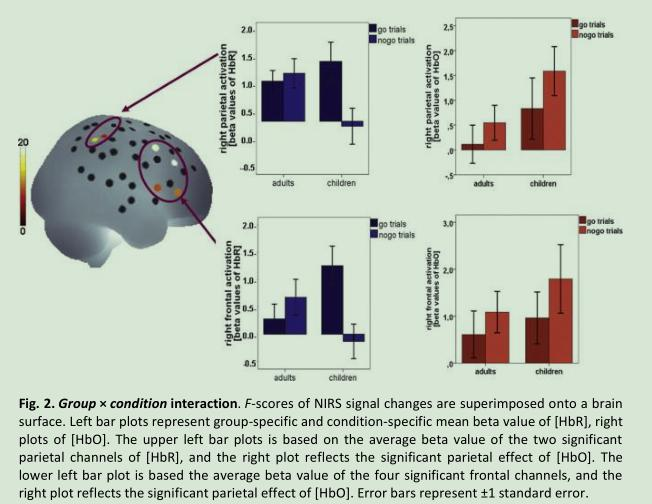 另外一項例子是關(guān)于反應(yīng)抑制能力的,即廣泛使用的 GO/NOGO 范式所進(jìn)行的測量,反應(yīng)抑制,是執(zhí)行功能的一個重要成份,對做出正確行為的決策,以適應(yīng)任務(wù)變化的要求有重要作用,其功能發(fā)展于兒童早期。行為數(shù)據(jù)表明,到 3 歲時,孩子已經(jīng)基本掌握評估響應(yīng)抑制任務(wù)的要求,但要直到 7 歲左右才能表現(xiàn)出能力提高。但是,在這發(fā)育過程中改變的神經(jīng)機(jī)制尚不清楚。在本研究中,研究者通過在近紅外(fNIRS)腦成像過程中應(yīng)用“GO/NOGO”范式,測量了 4 至 6 歲兒童的腦激活模式和行為表現(xiàn)。我們發(fā)現(xiàn)與成人相比,兒童與抑制相關(guān)的右側(cè)額頂--前額葉激活減少。相反,運(yùn)動相關(guān)的激活在年齡組之間沒有差異。我們的研究結(jié)果表明,在 4-6 歲年齡的兒童中,額頂腦成熟在抑制反應(yīng)的認(rèn)知發(fā)展中起著至關(guān)重要的作用。3