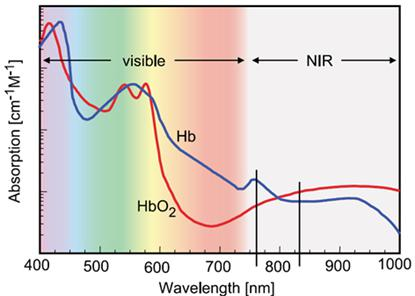 圖 1-3 氧合血紅蛋白和脫氧血紅蛋白對不同波長光的吸收率