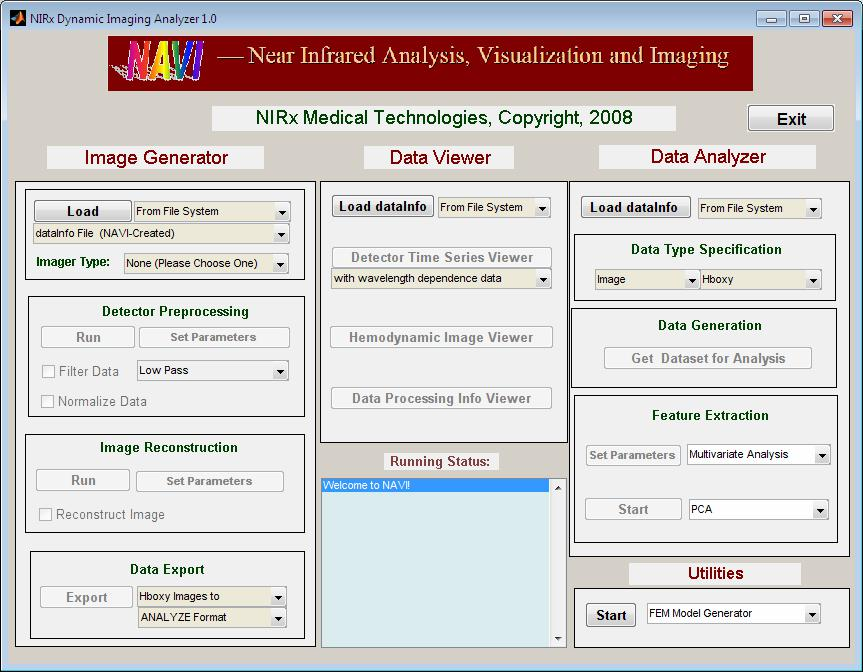 NAVI (Near-infrared Analysis, Visualization and Imaging) 是功能性 NIRS 數據 的分析軟件,可進行設備性能檢測,濾波,圖像生成,特征提取,可視化,統計學分析,文件和數據庫管理。NAVI 以 MATALAB 為基礎,在靈活的文件管理系統中提供點擊式的導航和可視化,在數據處理過程中使用向導以簡化組數據加載,批處理,自動文件系統創建,參數設置記錄等。通過各種方式可進行圖像可視化,使用蒙太奇格式進行多種特征信息的疊加。