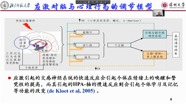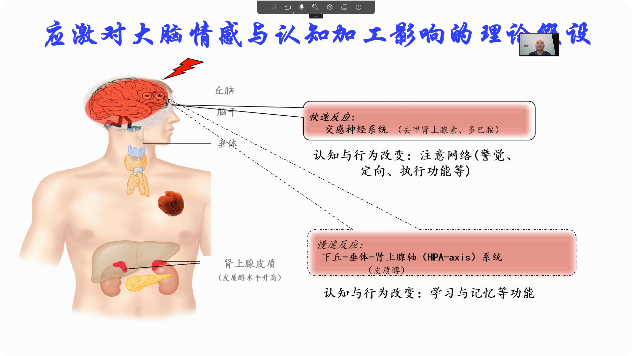 應激引起的交感神經系統的快速反應會引起個體在情緒上的喚醒和警覺性的提高,進而引起HPA-軸的慢速反應,則會引起個體學習及記憶等功能的改變。