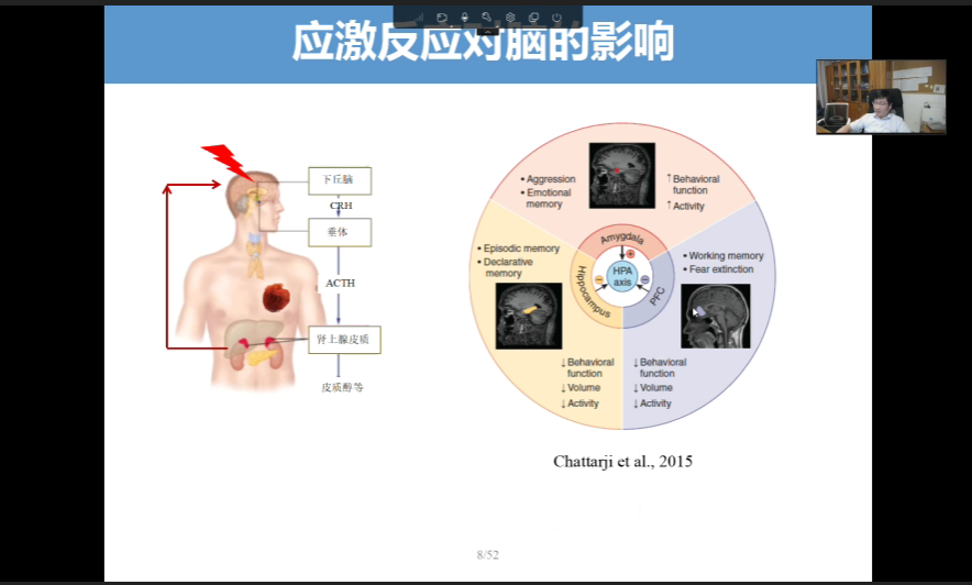 這些負(fù)面影響其實(shí)很多都是通過(guò)大腦來(lái)起作用。應(yīng)激情況下,剛才說(shuō)能夠產(chǎn)生一個(gè)終端產(chǎn)物叫皮質(zhì)醇。它的分子結(jié)構(gòu)比較小,能夠重新透過(guò)血腦屏障回到我們的大腦,會(huì)作用于我們大腦的一些靶器官,來(lái)對(duì)我們的腦功能、心靈產(chǎn)生影響。
