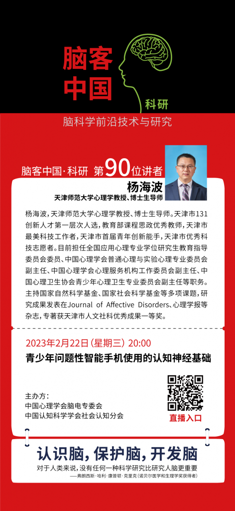 【直播預告】 2月22日晚20點 楊海波:青少年問題性智能手機使用的認知神經基礎
