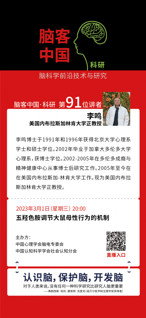 【直播預告】 本周三晚20點 李鳴:五輕色胺調節大鼠母性行為的機制
