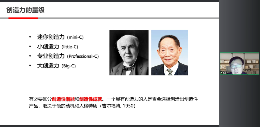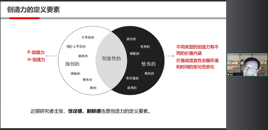 根據獨創性的參照不同,可以分為P-創造力和H-創造力。另外不同類型的創造,它其實有不同的價值內涵。比如說科學創造力的內涵就是理論性、學術性,但是藝術創造力的內涵就是審美性,而且創造的價值和適應性會隨著環境和時間的變化而變化。
