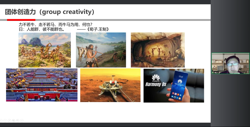 正因為我們人是群居的,有合作,所以我們人創造出來新的生產方式,新的生產工具,還有藝術、建筑和科技等。這就是我們人類群體創新性的產品。團體創造力是指團體為實現某一目標產生新穎的且適用的觀念、產品、過程或流程、問題解決方法的能力。