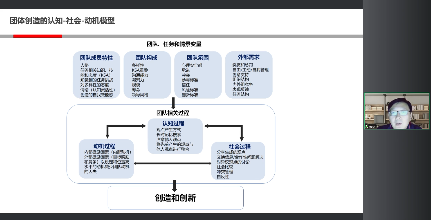 關于團體創造性,有一個很有名的認知-社會-動機模型。它實際上是說有很多的因素會影響到團隊相關的一些過程。包括團隊成員特征,團隊構成,團隊氛圍,外部需求。他們這些因素會影響到團隊相關的三個很重要的過程。一個是認知過程,就是觀點的產生,記憶的搜索,還有注意他人觀點;還會影響到動機過程和社會過程,特別是社會過程,團體創造性活動當中非常重要的一個過程,也是有別于個體創造性思維的一個很重要的過程。就是人和人之間要分享生成的觀點,要交換信息,也要做社會比較,沖突管理等等。通過影響三個重要的過程,進而影響到整個團體的創造和創新。