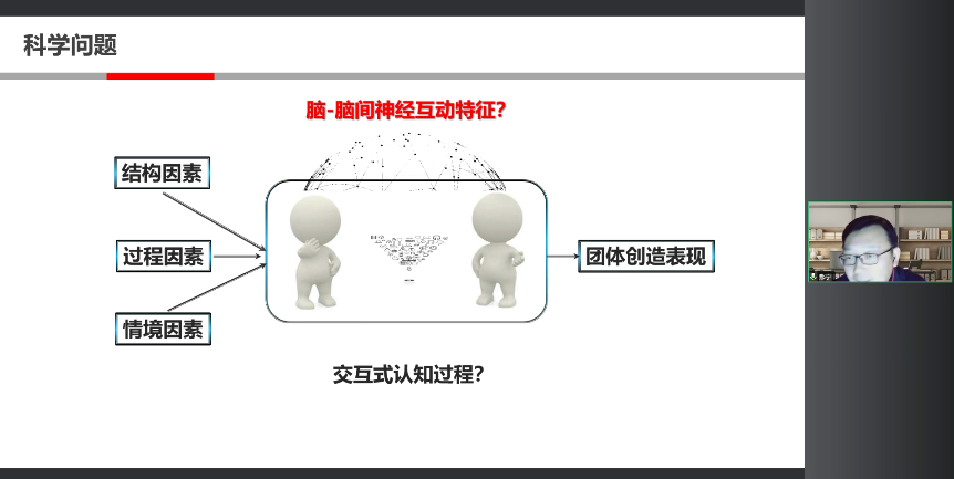 但是從我們心理學的角度看來,更關注的是過程和機制的問題。 這些因素它是怎么影響到人和人之間交互式的認知過程,怎么影響到人和人之間腦-腦間的神經互動,進而影響到團體創造力表現。所以我們的研究是關注中間過程,還有它的神經互動機制。