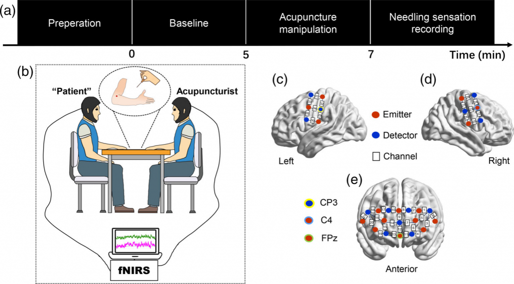 基于以上信息,2022年10月,成都中醫藥大學針灸推拿學院曾芳團隊發表文章,使用功能性近紅外光譜(fNIRS)超掃描(Hyperscanning)技術研究針灸期間針灸師與患者間的腦神經功能同步效應(INS),此項研究The increased inter‐brain neural synchronization in prefrontal cortex between simulated patient and acupuncturist during acupuncture stimulation: Evidence from functional near‐infrared spectroscopy hyperscanning發表在Hum Brain Mapp(IF:5.399)雜志。