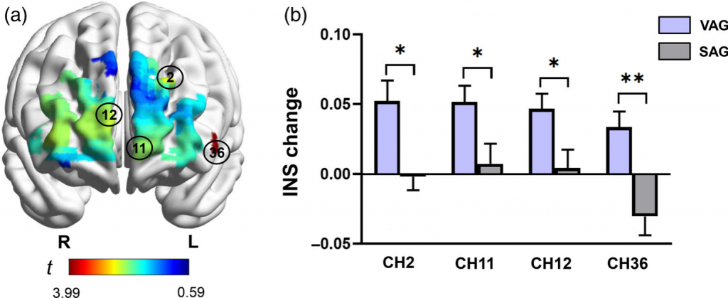 如下圖所示,與對照組(SAG)相比,實驗組(VAG)腦神經功能同步在CH2(VAG:0.052±0.082,SAG:-0.002±0.056,t=3.088,p=0.020,Cohen‘s d=0.774),CH11(VAG:0.051±0.065,SAG:0.007±0.081,t=2.373,p=0.045,Cohen‘s d=0.597),CH12(VAG:0.047±0.059,SAG:0.004±0.073,t=2.504,p=0.039,Cohen‘s d=0.646),CH36(VAG:0.033±0.062,SAG:-0.031±0.077,t=3.989,p=0.003,Cohen‘s d=0.912)存在統計學差異。