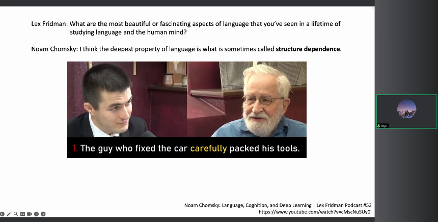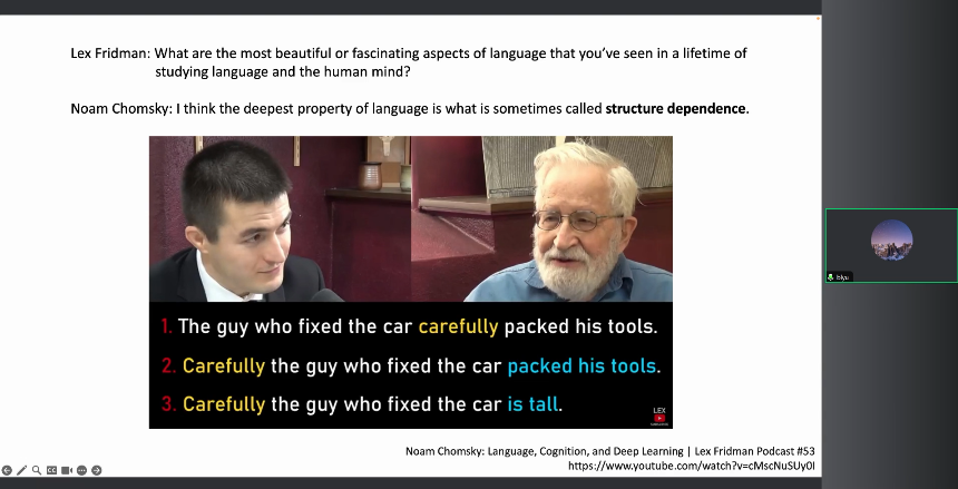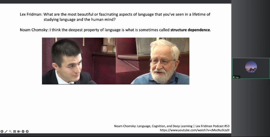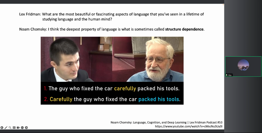 今天的分享我想首先從一個采訪開始。畫面左邊的是主持人,右邊的這位長者叫做Noam Chomsky。他可以說是過去幾十年甚至一個世紀以來最偉大的認知科學家和語言學家。他最著名的理論就是他提出的語言加工的結構化表征。他憑一己之力對語言學研究帶來了革命性的推動及發展。