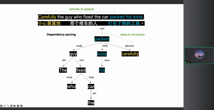甚至當這句話它意義上是講不通的。比如說他又舉了一個例子,“Carefully the guy who fixed the car is tall,這里面我們還是嘗試會把‘carefully’和‘is tall’合在一起。雖然我們知道‘carefully’和這個人‘is tall’是完全沒有關系的。但是我們大腦會傾向于把‘carefully’這個副詞和后面的‘is tall’結合在一起。