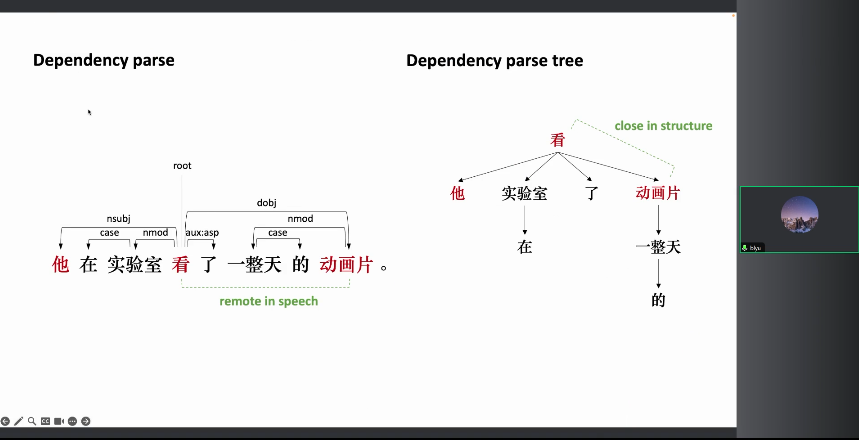 這個現象或者說規律并不只是對英語成立的,對我們中文及所有語言都是成立的。 比如說這句話,“他在實驗室看了一整天的動畫片”。我們在理解這句話的時候,會把看和動畫片緊密的關聯在一起,看動畫片的動作是自然而然的就在我們大腦中出現的。 雖然兩者之間還隔了“一整天的”這樣一段語音,但是我們的大腦還是能夠自然而然的把看和動畫片整合在一起。原因就像剛才的英語句子一樣,在這個中文例子的句法樹結構中,看和動畫片是更為接近的。