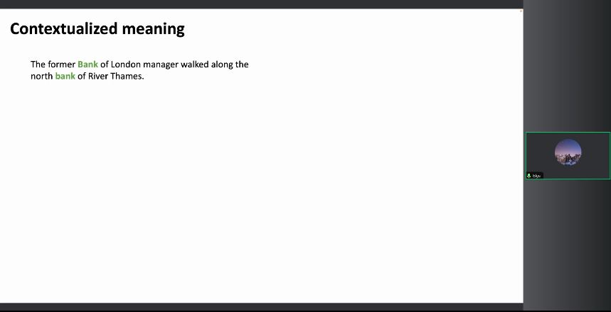 具體的我們可以看下圖這樣一句話,里面有兩個bank。 第一個bank它的意思是銀行,第二個bank是河岸。不管是在中文還是在英文里面,很多詞都有多個語義。在我們理解它時,具體應該選哪個語義就取決于它所在的語境。比如說第一個bank,它是bank of london,就是倫敦銀行,我們就選擇它作為銀行的意思。 第二個是泰晤士河河畔,那它就是河岸的意思。