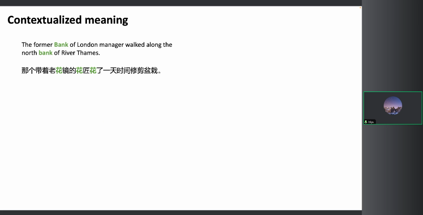 除了有結構的特點之外,語言另外一個比較顯著的特點就叫做這個Contextualized meaning。 就是我們對一個詞,對一個概念的理解是有特定語境限制的。