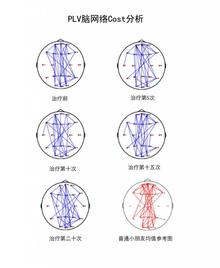 分析:PLV網(wǎng)絡(luò)表現(xiàn)各個腦區(qū)之間的信息交流,兩個節(jié)點之前有連線表示兩個節(jié)點對應(yīng)的腦區(qū)之間存在信息交流。該患者經(jīng)過20次治療,長連接明顯增多,短連接減少,表明大腦處理信息的能力增強。