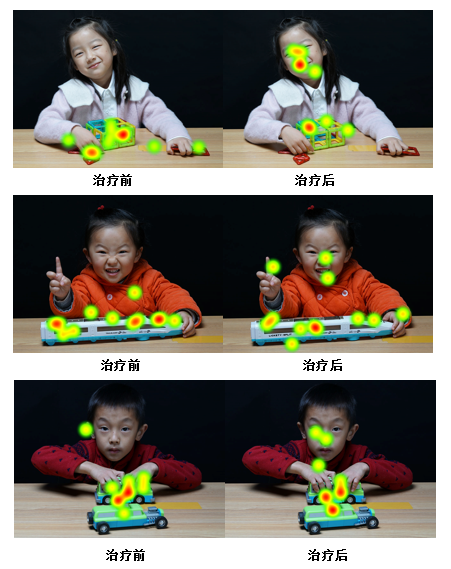 分析:熱點圖反映了受試者在治療前后對于不同刺激材料注視時長的變化情況(熱點圖的顏色越深表示對該區(qū)域注視時間越長,若某張圖無熱點則表明受試者在眼動數(shù)據(jù)采集時沒有注視該圖片)。治療后受試者對包含玩具的社會性圖片中的人臉注視時長增加。