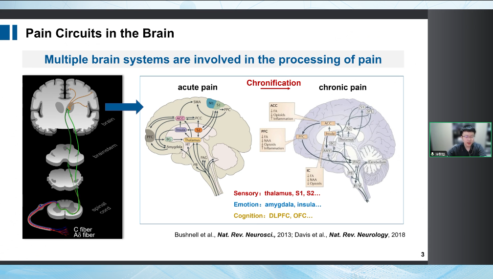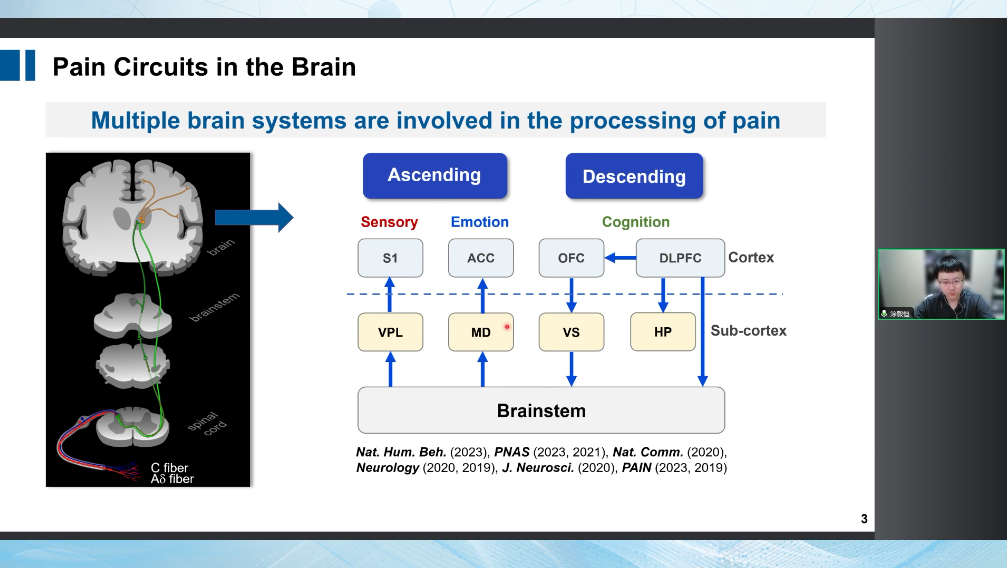 在過去5年,我們課題組就系統(tǒng)性的研究了疼痛,特別是人類疼痛的神經(jīng)網(wǎng)絡(luò)表征。我們關(guān)注了疼痛的上行和下行傳導(dǎo)的兩條通路。在上行傳導(dǎo)通路里面我們關(guān)注的是丘腦皮層的通路,丘腦是感覺信號(hào)上行傳導(dǎo)的中繼站,他負(fù)責(zé)將上行傳導(dǎo)信號(hào)投射到大腦皮層上。我們發(fā)現(xiàn)丘腦通過投射不同核團(tuán)到不同的腦區(qū)處理多種疼痛信息。而在下行調(diào)控方面,我們關(guān)注認(rèn)知因素怎么通過影響前額葉腦區(qū),然后投射到皮層下的區(qū)域,進(jìn)而影響疼痛的感受。