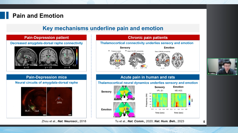 我們自己團(tuán)隊(duì)的研究也是在慢性疼痛、急性疼痛誘發(fā)人類被試和大鼠上去研究了丘腦皮層的神經(jīng)活動(dòng)怎么樣來參與處理感覺和情緒信息。我們就發(fā)現(xiàn)它是有不同的丘腦皮層連接和神經(jīng)活動(dòng)來參與處理疼痛這兩個(gè)維度的信息。