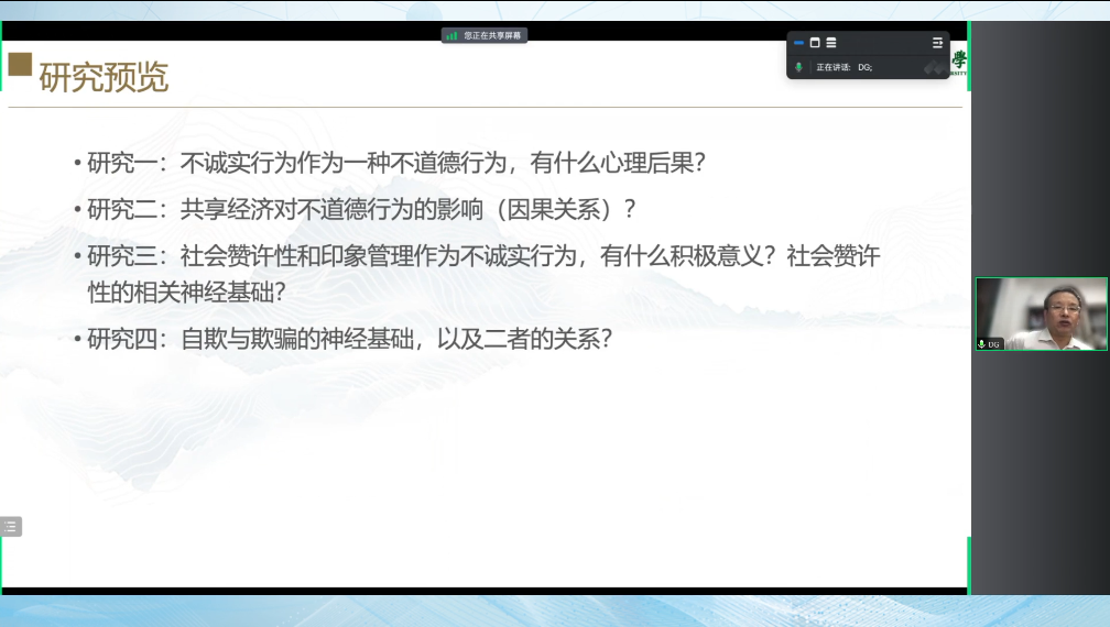 2024年7月24日晚20點(diǎn),中山大學(xué)心理學(xué)二級(jí)教授高定國老師作為腦客中國科研第152位講者為大家?guī)碇黝}為《不誠實(shí)行為的心理后果及神經(jīng)基礎(chǔ)》的報(bào)告。以下內(nèi)容節(jié)選自直播視頻:
