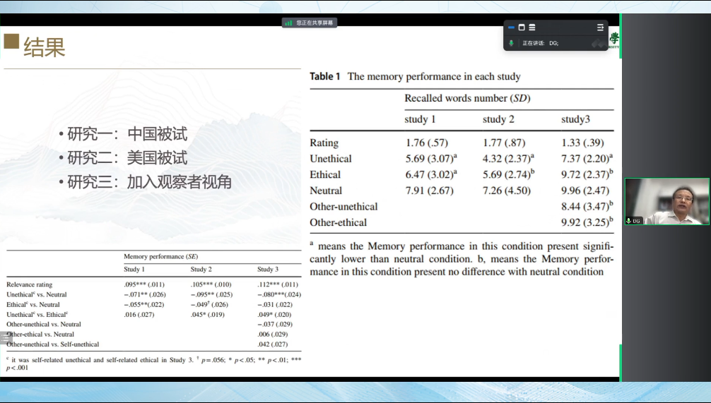 我們總共做了三個(gè)研究,分別是選取的中國被試,美國被試以及加入觀察者視角。基于實(shí)驗(yàn)結(jié)果我們進(jìn)行了迷你云分析,得到的結(jié)論是非道德行為和道德行為均會(huì)損害對(duì)后續(xù)材料的記憶,但前者的影響會(huì)更大。