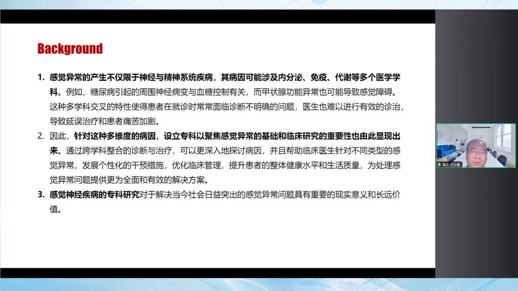 2024年10月9日晚20點,首都醫科大學宣武醫院博士生導師王紅星教授作為腦客中國科研第162位講者為大家帶來主題為《感覺神經病學—— 一個新的神經病學亞專業》的報告。以下內容節選自直播視頻: