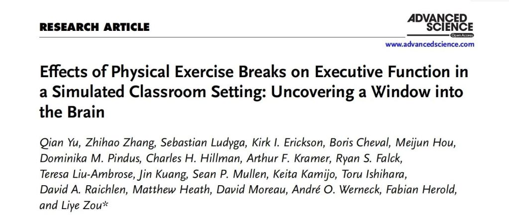 近期,深圳大學鄒立業教授(通訊作者)及其團隊在Advanced Science期刊(IF= 14.3)發表了題為“Effects of Physical Exercise Breaks on Executive Function in a Simulated Classroom Setting: Uncovering a Window into the Brain” 的文章,研究發現,在久坐期間進行短暫運動干預能夠改善執行功能,對提高認知表現有積極影響。