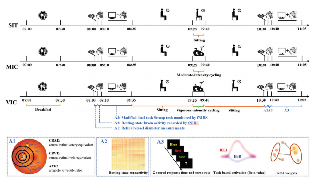 在此背景下,本研究通過雙Stroop任務測量、fNIRS皮層血流動力學和視網膜微血管狀態測量,研究久坐期間體育鍛煉干預對執行功能的影響。為了模擬現實世界的場景,兩段久坐和運動休息的時間被設定為與國內大學的連續兩節課和休息時長一致。