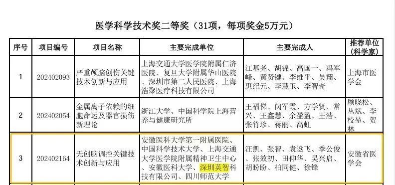 2025年1月6日,中華醫學會科技評審部公布2024年中華醫學科技獎獲獎項目。其中深圳英智科技有限公司與安徽醫科大學第一附屬醫院、中國科學技術大學、上海交通大學醫學院附屬精神衛生中心、安徽醫科大學、四川師范大學5大單位共同開展的“無創腦調控關鍵技術創新與應用”項目獲評中華醫學科技獎醫學科學技術獎二等獎。