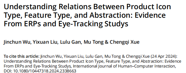 東南大學(xué)機(jī)械工程學(xué)院的薛澄岐教授團(tuán)隊(duì)于2024年4月在INTERNATIONAL JOURNAL OF HUMAN COMPUTER INTERACTION(5-Years IF =4.5)發(fā)表名為Understanding Relations Between Product Icon Type, Feature Type, and Abstraction: Evidence From ERPs and Eye-Tracking Studys 的研究。