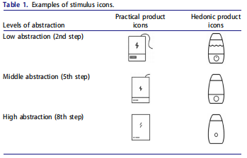 1、從IoT(物聯(lián)網(wǎng))領(lǐng)域中選取了60個(gè)產(chǎn)品,通過(guò)問(wèn)卷調(diào)查讓受試者將每個(gè)產(chǎn)品圖像歸類為實(shí)用產(chǎn)品或娛樂(lè)產(chǎn)品,并對(duì)其形式的復(fù)雜性進(jìn)行評(píng)分。同時(shí),使用Adobe Illustrator 2021軟件的混合工具設(shè)置圖標(biāo)抽象程度(如圖1所示),并生成了刺激圖標(biāo)示例(表1)。