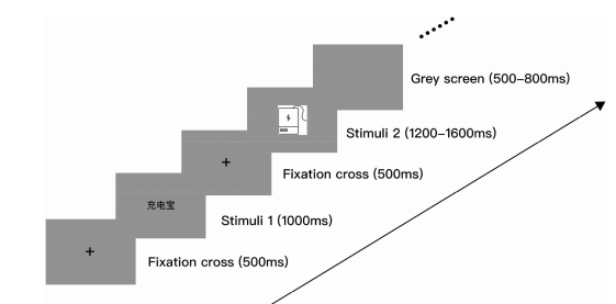 采用S1-S2范式。每次試驗(yàn)開(kāi)始時(shí),受試者注視屏幕中央500毫秒。隨后,在屏幕中央呈現(xiàn)一段文本S1(產(chǎn)品中文名稱),持續(xù)1000 ms。然后,出現(xiàn)灰色屏幕,持續(xù)500 ms,然后是一個(gè)目標(biāo)S2(包括與S1匹配和不匹配的條件),持續(xù)時(shí)間1200-1600 ms(見(jiàn)圖2)。受試者被要求盡快用左手或右手食指按下相應(yīng)的鍵(文本與圖片一致按“Q”,不一致按“P”)。按鍵之后,出現(xiàn)隨機(jī)持續(xù)500 - 800ms的灰色屏幕,然后開(kāi)始新的試驗(yàn)。本實(shí)驗(yàn)為2(產(chǎn)品類型:實(shí)用產(chǎn)品vs.娛樂(lè)產(chǎn)品)×3(抽象層次:低、中、高)實(shí)驗(yàn)設(shè)計(jì),共6個(gè)條件。