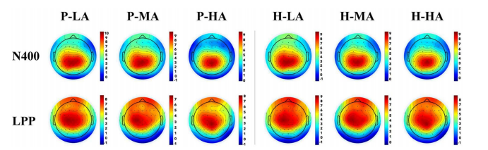 圖4 在380 ~ 480 ms (N400)和600 ~ 800 ms (LPP)的時(shí)間窗,6種條件下的腦電地形圖