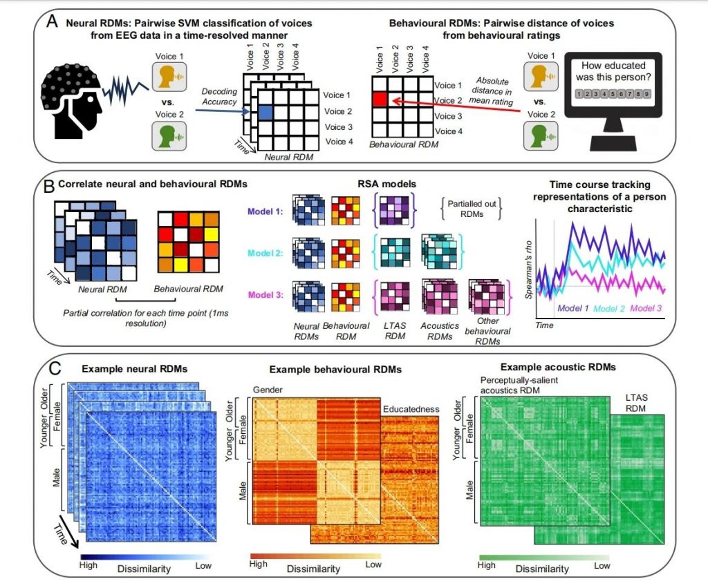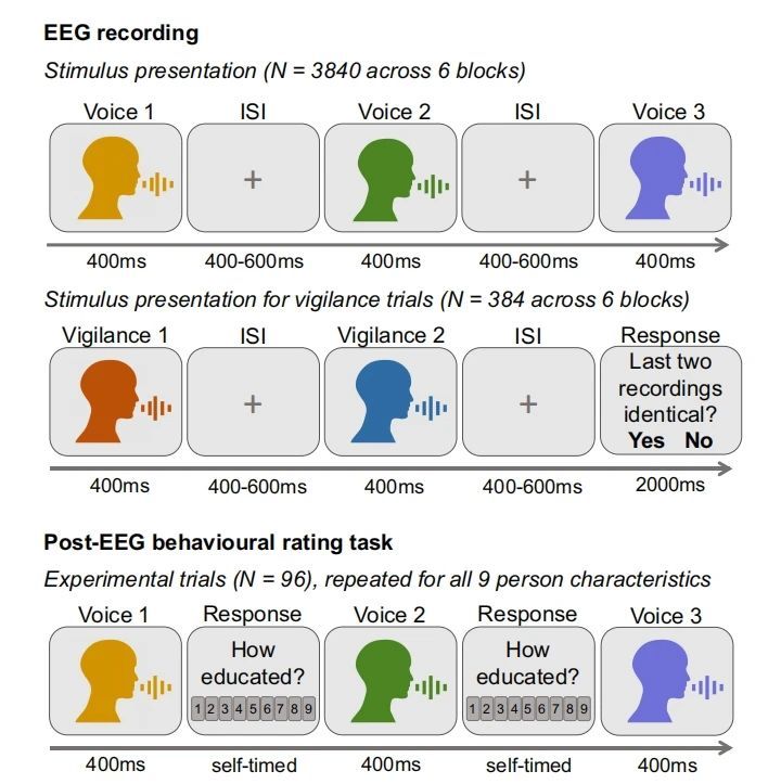 我們?cè)诼?tīng)到一個(gè)聲音后的大約80毫秒時(shí),就開(kāi)始形成對(duì)說(shuō)話者的多方面印象,包括身體特征(如性別、年齡、健康狀況),還包括性格特征(如吸引力、支配力、可信度)和社會(huì)特征(如教育水平、職業(yè)素養(yǎng))。本研究使用腦電和表征相似性分析(RSA)來(lái)描述這些來(lái)自聲音的多維印象是如何隨著時(shí)間的推移在不同的抽象水平上出現(xiàn)的。研究發(fā)現(xiàn),這些印象并非同時(shí)形成,而是逐步出現(xiàn):關(guān)于身體特征(如性別、年齡)的印象較早就形成,大約在120毫秒時(shí)就能出現(xiàn);而關(guān)于個(gè)性特征和社會(huì)特征(如吸引力、教育水平等)的印象則稍晚一些,大約在360毫秒之后才開(kāi)始形成。