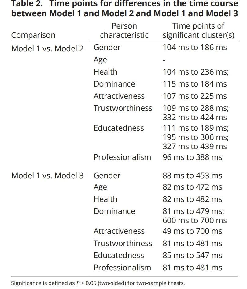神經(jīng)和行為RDM(代表性距離矩陣)之間顯著相關(guān)性,所有人物特征的表征都可以在刺激開(kāi)始后80 ms到102 ms之間被檢測(cè)到,并在100 ms到200 ms之間達(dá)到第一個(gè)峰值,這些表征通常會(huì)持續(xù)到至少435 ms,如性別特征。在持續(xù)時(shí)間上,性別、主導(dǎo)性、吸引力、教育程度等特征的表示通常在刺激結(jié)束后不久便檢測(cè)不到了,其他人物特征(如健康、信任度、專業(yè)性等)則可以持續(xù)更長(zhǎng)時(shí)間,如專業(yè)性的表征在采樣時(shí)間窗口的末尾仍然顯著(見(jiàn)圖3,紫色線,表1)。