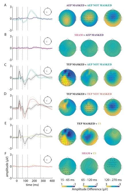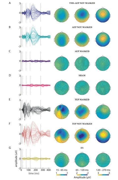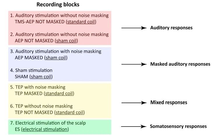 每次TMS脈沖釋放時都會產生明顯的“咔噠”聲音,從而通過空氣和骨傳導引發聽覺誘發電位(AEP)。此外,TMS還會在頭皮上產生咔噠感,這可能至少在理論上會誘發軀體感覺誘發電位(SEP)。因此有人認為,TEP主要是由TMS中附帶的聽覺和軀體感覺刺激引起的。在這項研究中,比較了具有不同軀體感覺和聽覺成分貢獻的條件下的TEP:真實TMS刺激在有無噪音掩蔽的條件下、純聽覺刺激在有無噪音掩蔽的條件下、頭皮電刺激和偽刺激條件,探討這些混雜因素對刺激初級運動皮層(M1)時誘發的TEP波形的貢獻。