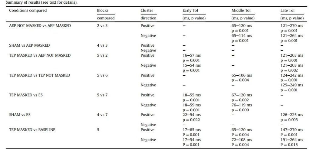 在比較未掩蔽AEP和掩蔽AEP條件(block 2和block 3;見圖3的A行)時,早期沒有發現顯著的EEG團塊(cluster)。中期在中央電極上發現了一個顯著的正向團塊,在外圍電極上則出現了一個負向團塊。晚期觀察到中央區出現了負向團塊,而在外圍電極上則出現了正向團塊(見表1,第一行)。這些結果表明,由TMS咔噠聲引起的AEP(聽覺誘發電位)在EEG信號中表現為明顯的負峰(約100 ms)和正峰(約200 ms),并且這些波形主要分布在頂區域。并且這些AEP成分可以通過噪音掩蔽有效地被抑制。