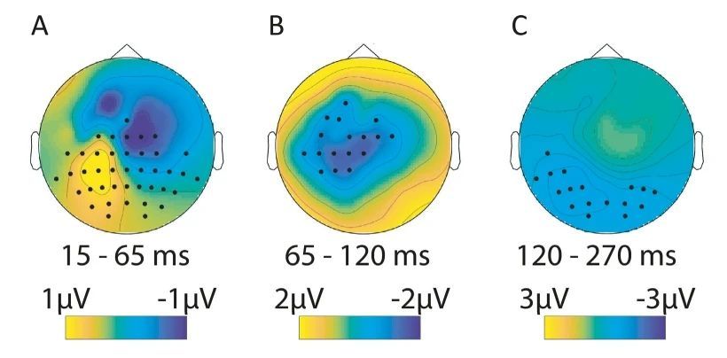 單獨的頭皮電刺激相比其他使用標準TMS的實驗組產生了非常小的反應(圖2)。與偽刺激相比,早期窗口(約40 ms)在后腦電極處觀察到顯著的負電位。第二個較弱的電位出現在中央區附近的約200 ms時,表現為正電位,這可以解釋為與多模態刺激相關的喚醒相關反應(SRMR)。可以認為,約180-200 ms時在頂點周圍出現的正波代表了由外周輸入引起的SRMR。