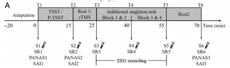 如圖1A所示,受試者到達實驗室后會先休息20分鐘。在休息時間的最后5分鐘,使用積極和消極情緒量表(PANAS)和狀態(tài)-特質(zhì)焦慮量表(SAI)評估受試者的情緒狀態(tài)和焦慮水平。同時進行腦電圖準(zhǔn)備。在TSST(T1)前收集第一次唾液樣本和自我報告壓力(SR)問卷(Likert量表),建立基線。隨后,受試者進行了15分鐘的TSST或安慰劑TSST。在TSST (T2)后立即采集第二組唾液樣本并收集問卷(SR、PANAS、SAI)數(shù)據(jù)。接下來休息10 min(rest 1),在這個階段對受試者進行重復(fù)經(jīng)顱磁刺激,并在之后采集第三份唾液樣本和SR。接下來是4個額外獨特刺激任務(wù),每個大約持續(xù)7分鐘。在T4和T5采集唾液樣本和SR。在第二次休息15分鐘(rest 2)后,進行第三次SAI和PANAS問卷調(diào)查(T6)。