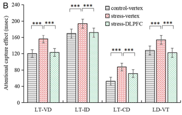 與對照組相比,LT-VD、LT-ND、LT-ID和LT-CD條件中壓力DLPFC的N2pc效應(yīng)顯著增加(p < 0.001),而LD-VT條件中N2pc效應(yīng)不顯著(p = 0.090)。
