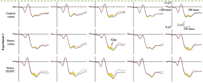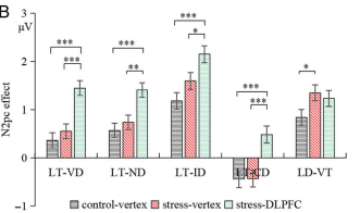 與壓力頂葉組相比,壓力DLPFC條件的N2pc效應(yīng)比LT-ND條件(p = 0.002),LT-ID條件(p = 0.028)和LT-CD條件(p < 0.001)更強(p < 0.001) 。