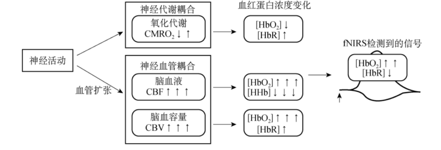 功能性近紅外腦成像技術(functional nearinfrared spectroscopy, fNIRS)的檢測建立在血氧濃度變化帶來的局部腦組織光學屬性(如吸收與散射系數)改變的基礎之上。局部腦組織中血紅蛋白濃度的變化會觸發一系列的復雜的大腦調節活動,根據神經血管耦合假說,這種緩慢變化的血液動力學響應能夠反映局部腦組織內的神經元活動及其變化規律。