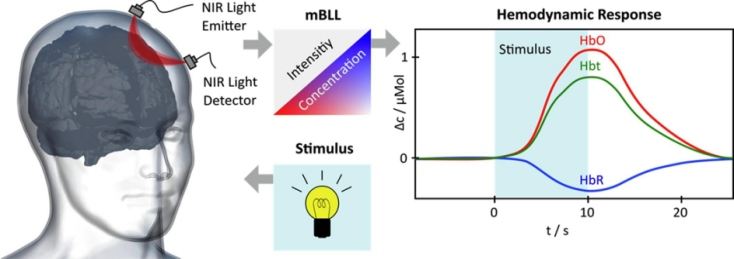 使用近紅外腦成像設備時,將光源、探測器置于頭部相應部位,光源發射的光進入組織或細胞,在歷經一系列吸收、散射事件后,仍會有一部分光子到達皮層表面,探測器可以接收到這些光信號。大腦活動時,神經元的代謝發生變化,導致局部區域的血流量增加,氧合血紅蛋白HbO的濃度相對升高,脫氧血紅蛋白HbR的濃度相對降低。這會引起近紅外光吸收的改變,被探測器檢測到 。