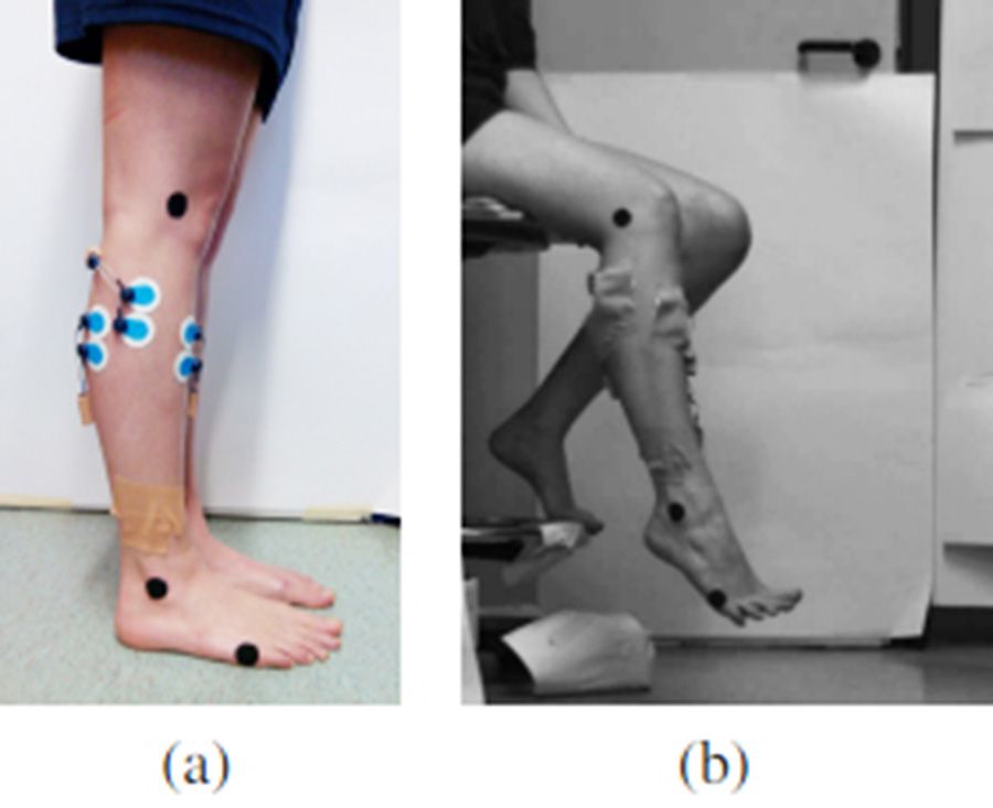 跖屈的動作通過相機記錄,3個循環標記點分別放在腓骨上端、外側踝和第五跖骨,如圖所示。