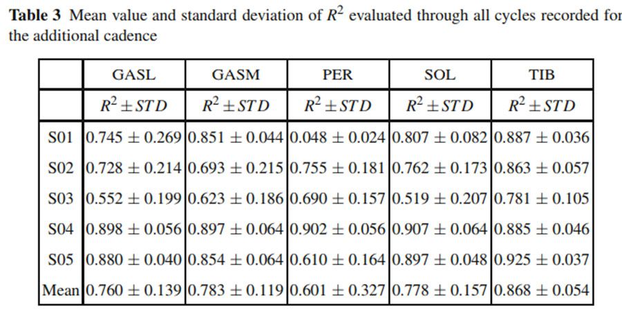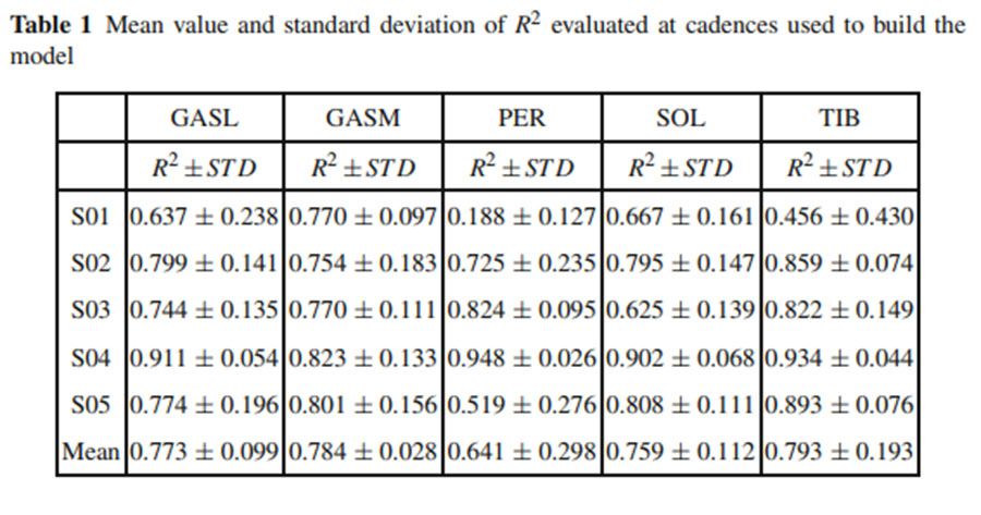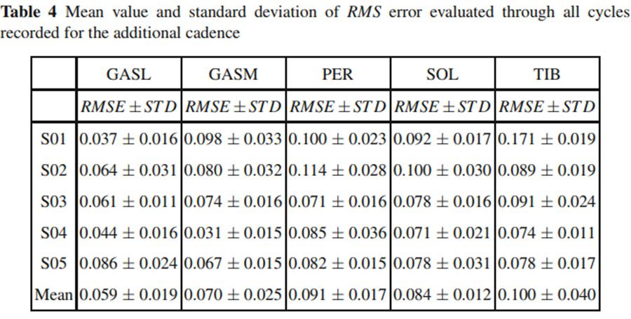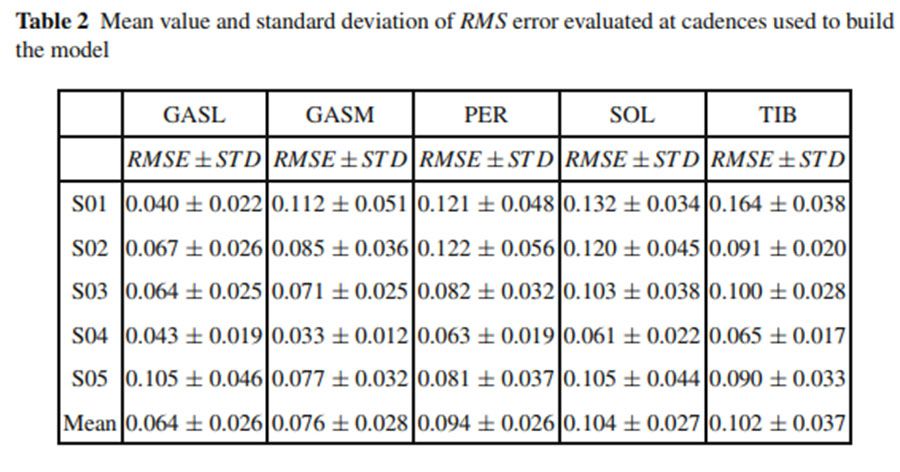Tables1 和2都列出了從5個受試者肌肉中獲得的標準化EMG信號的R2 和RMSE值,整體的R2值是0.75,表明預測的曲線和實驗曲線是相關的。平均的RMSE值是0.088±0.022。第二次測試的結果如Tables3 和 4所示,和第一次的測試結果類似。