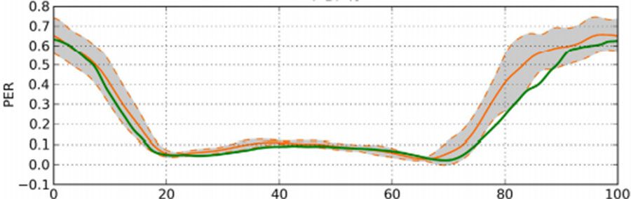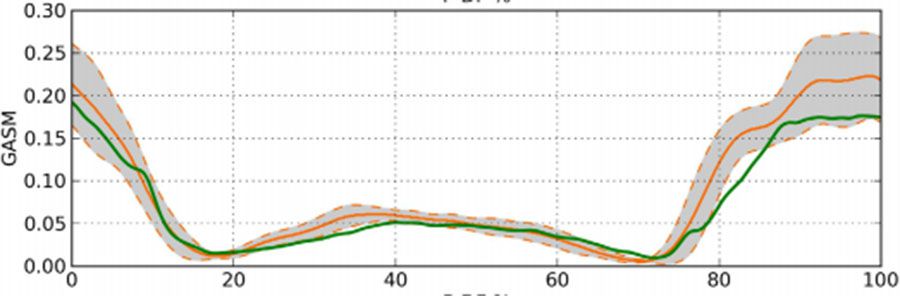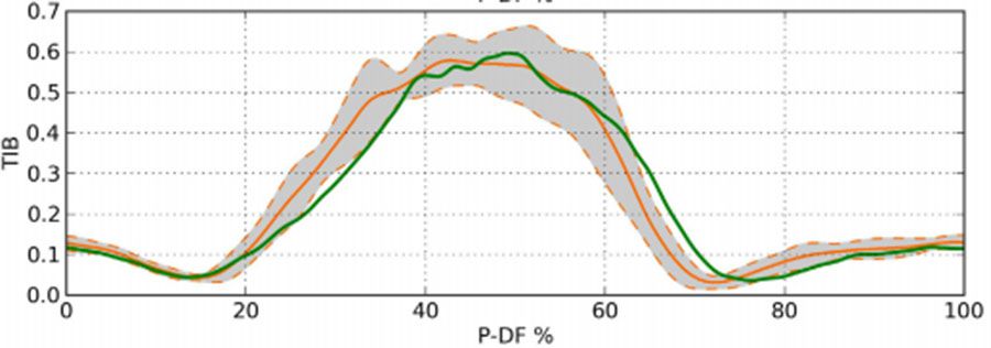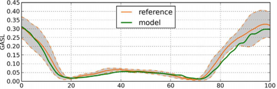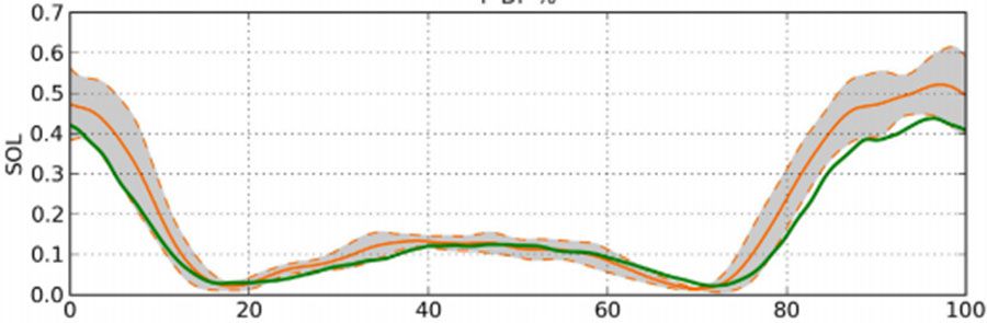 上圖為預測的EMG信號和測量的信號各個肌肉比較,橫坐標為跖屈的收縮百分比,數據均來自于4號受試者的AC頻率跖屈收縮,灰色區域為±標準差的參考范圍間隔區域,綠線為模型預測值。可以看出綠線基本落在灰色區域內,說明EMG模型預測能力較好。